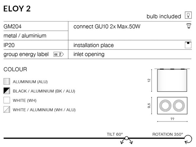 Eloy to lampy o formie kwadartu, wykonane z aluminium. Wykorzystanie surowców wysokiej jakości sprawia, że lampy są wyjątkowo trwałe i odporne na różnego rodzaju szkodzenia mechaniczne. Źródło światła w lampach Eloy jest ruchome, co pozwala na skierowanie wiązki światła w dowolnym kierunki. Źródło światła w lampach ELOY może być regulowane za pomocą ruchu obrotowego w granicach 350° jak i poprzez wychylenie w zakresie 60°. Lampa współpracuje ze źródłami światła z gwintem GU10, odpowiednie do tej lampy będą również żarówki LED.