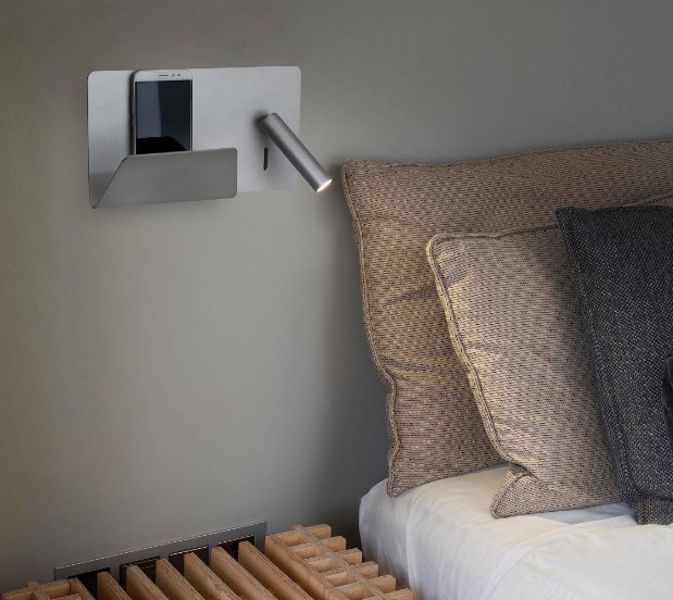 Dzięki kinkietowi Suau możesz bezpośrednio przy łóżku ładować telefon lub tablet.