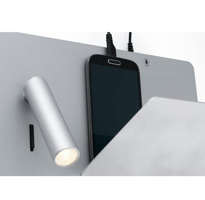 - Nowoczesny kinkiet do sypialni z wygodną półką, portem USB do ładownia telefonu oraz wbudowanym źródłem światła LED.
