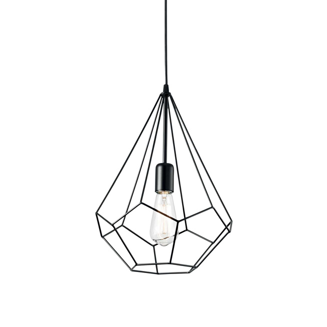 Klasyczna lampa wisząca, której uroku dodaje ciekawy, przestrzenny klosz wykonany z metalowych prętów.