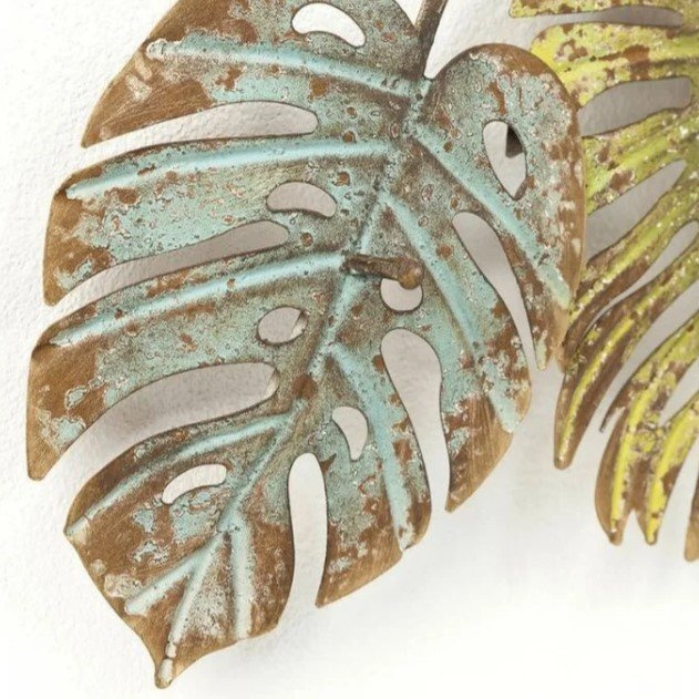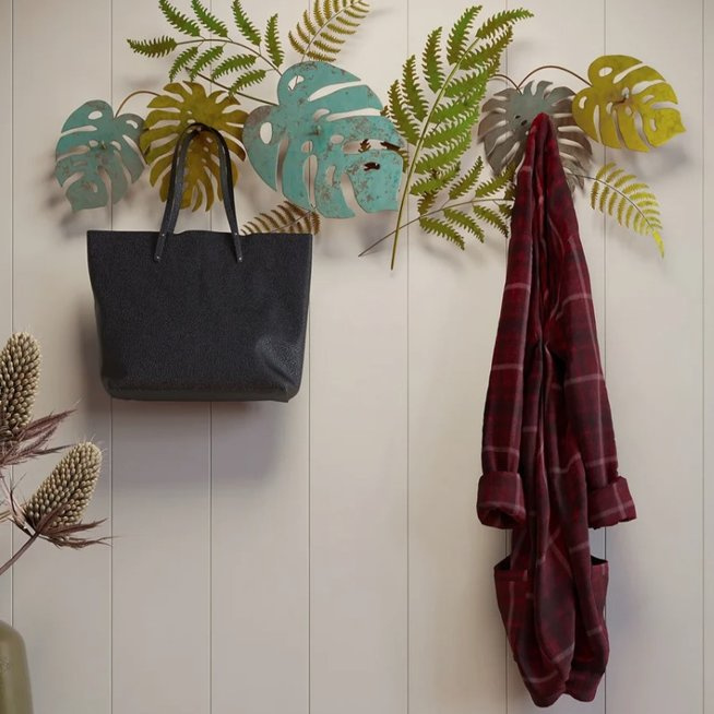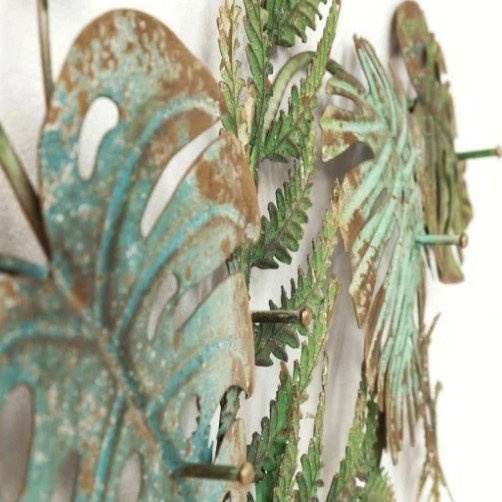 - Duży ścienny wieszak z motywem liści z lasu deszczowego. Pomiędzy paprociami i liśćmi palmowymi znajduje się pięć haczyków na kurtki, płaszcze czy torby.