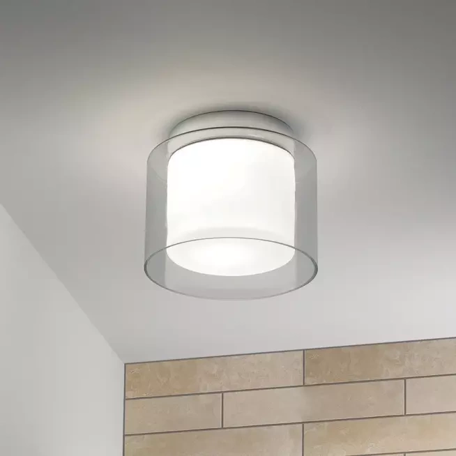 Plafon sufitowy do łazienek Astro AREZZO CEILING wykonany jest z metalu wykończonego w wersji chrom polerowany oraz szkła mlecznego, pełniącego rolę dyfuzora rozpraszającego światło, a także szkła przeźroczystego na zewnątrz lampy . Posiada klasę szczelności IP44, co umożliwia stosowanie jej w łazienkach w strefach: 2 i 3, a także innych miejscach o podwyższonej wilgotności.