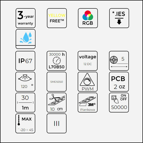 Technologia Yellow Free oznacza, że obudowa produktu wykonana została z wysokiej jakości materiałów, które nie żółkną z upływem czasu, a produkt zachowuje estetyczny wygląd przez lata. Produkt ma podwyższony stopień ochrony IP, co przekłada się na szerszą skalę zastosowania oraz wyższe bezpieczeństwo użytkowania. Prezentowana taśma LED line® emituje kolory w palecie barw RGB. Produkt przeszedł badania w Centrum Badań i Pomiarów Światła LED line®, na podstawie których zostały przygotowane miarodajne pliki fotometryczne. Na produkt udzielana jest trzyletnia gwarancja producenta. Deklarowany zakres temperatury barwowej dotyczy pojedynczej diody LED bez dodatkowej powłoki