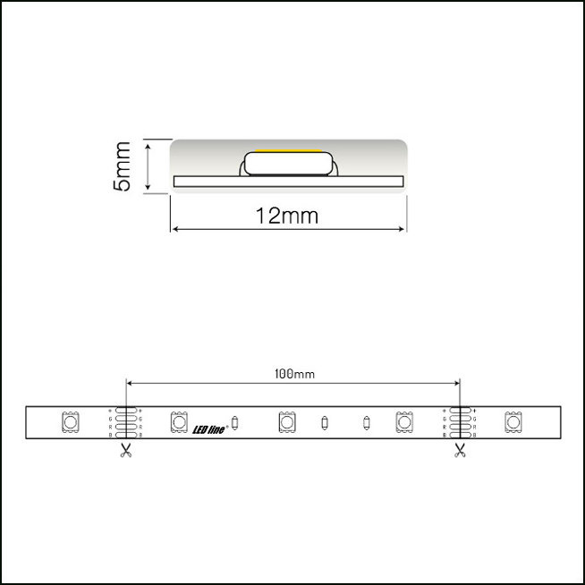 Ilość diod na metr bieżący taśmy to 30 SMD. Temperatura barwy światła to: K Długość fali 620, 520, 465nm. Taśma jest dostarczana na rolce o długości 5 m. W produkcie zastosowano diodę typu SMD5050. Taśma ta o poborze prądu 0,6 A osiąga skuteczność świetlną lm/W przy zachowaniu zużycia energii elektrycznej na poziomie 7,2 W na metr bieżący. Strumień świetlny emitowany z jednego metra taśmy wynosi lm. Taśma zasilana jest napięciem stałym 12 DC. Kąt świecenia diody wynosi 120 °. Grubość laminatu PCB taśmy wynosi: 2.