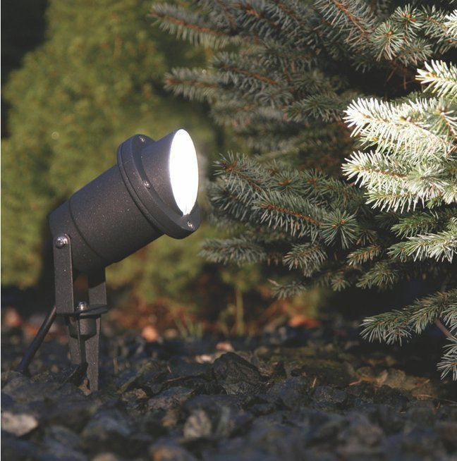 - Nowoczesny reflektorek ogrodowy do wbicia w ziemię. Lampa ogrodowa wykonana z aluminium w kolorze grafitowym i szkła. Mobilna główka reflektora pozwala na ukierunkowanie strumienia światła.