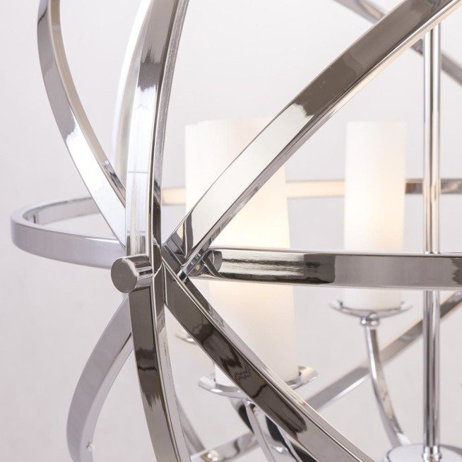 W środku kuli znajduje się 6 kloszy z mrożonego szkła, ustawionych na giętych metalowych ramionach świecznika.