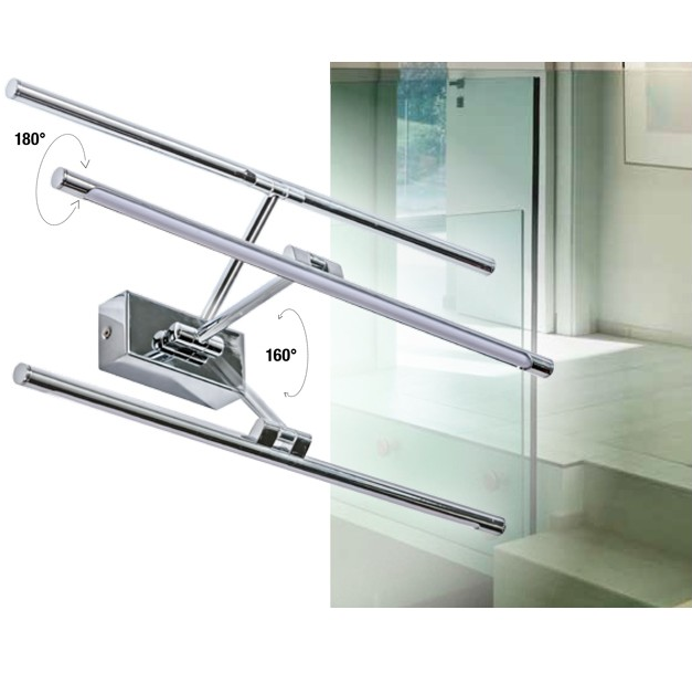 - Nowoczesny kinkiet z obrotowym źródłem światła polecany do oświetlania obrazów i nad lustra w łazience.