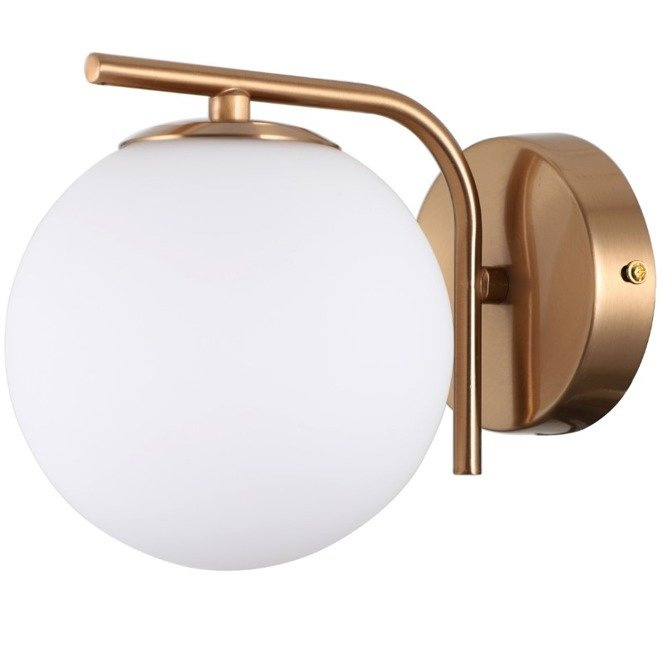 • Elegancki kinkiet na złotej podstawie ze szklanym kloszem w kolorze białym.