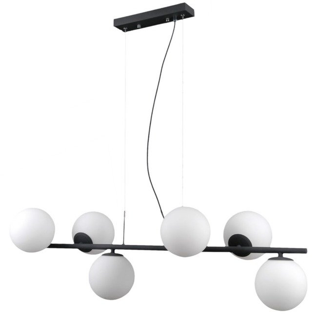 - Nowoczesna, podłużna lampa wisząca z sześcioma kloszami z mlecznego szkła. Idealna do powieszenia nad stołem w jadalni lub nad wyspą kuchenną / barem.
