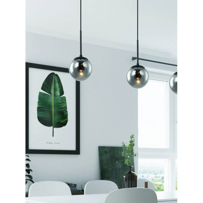 • Elegancka lampa wisząca w kolorze czarnym z kloszem z dymionego szkła