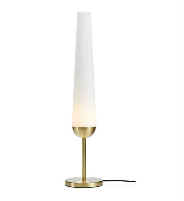 • Podłużna lampa stołowa wykonana z metalu w kolorze złotym i białego szkła. Projektant: Joakim Thedin.