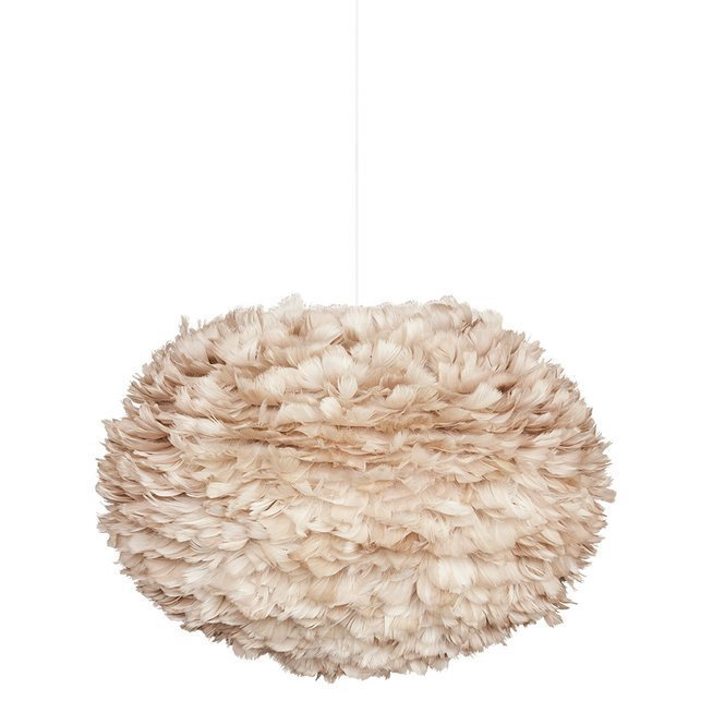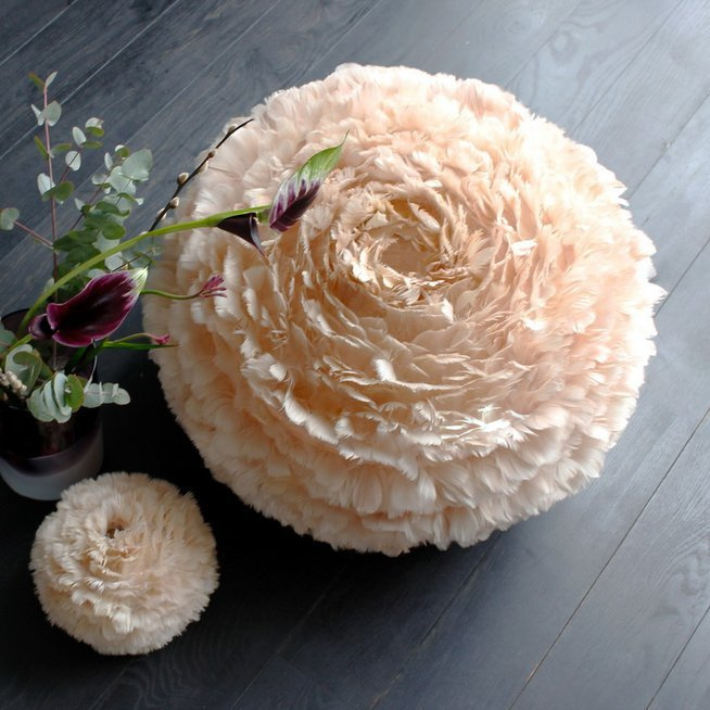 Pojedyncze piórka zostały ręcznie nałożone na papierowy rdzeń, dzięki czemu lampa prezentuje się wyjątkowo efektownie.