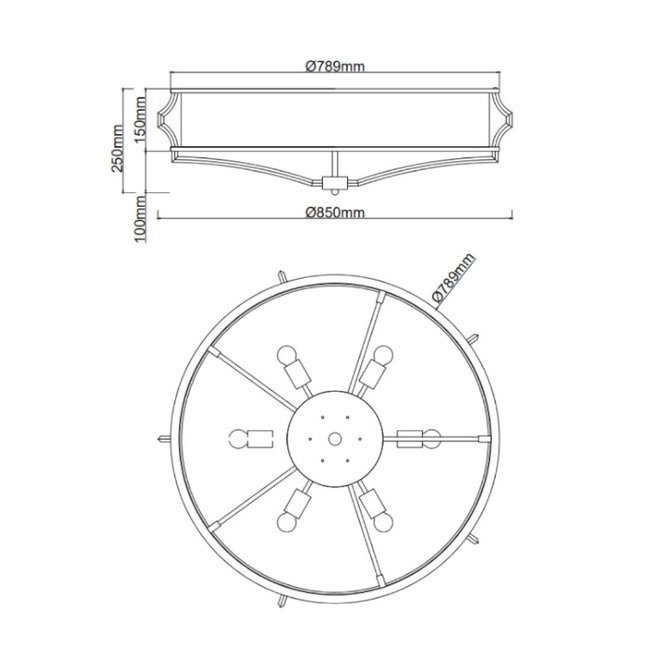 Abażur rozświetla sześć źródeł światła umieszczone wewnątrz metalowego stelaża.