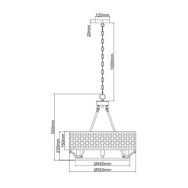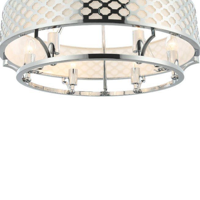 Abażur rozświetla sześć źródłeł światła umieszczone wewnątrz metalowego stelaża.