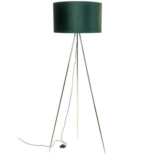 - Nowoczesna lampa stojąca z abażurem w kolorze eleganckiej zieleni i złotą podstawą.