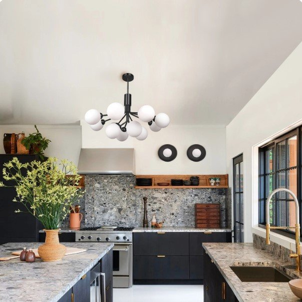 Nowoczesna, okrągła lampa sufitowa z białą szklaną kulką.