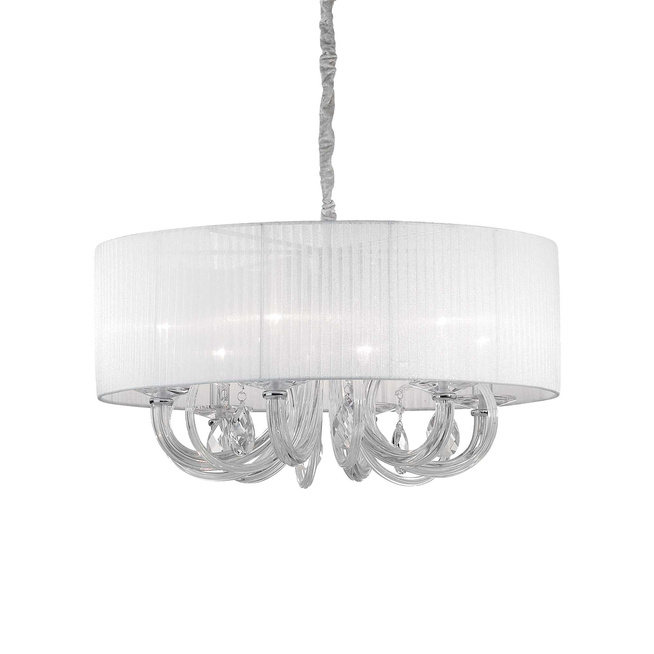 - Na chromowanym metalowym zawieszeniu. Ręcznie dmuchana szklana rama z precyzyjnie wyciętymi jkryształowymi elementami dekoracyjnymi. Abażur z plisowanej organzy. Aksamitna osłona łańcucha.