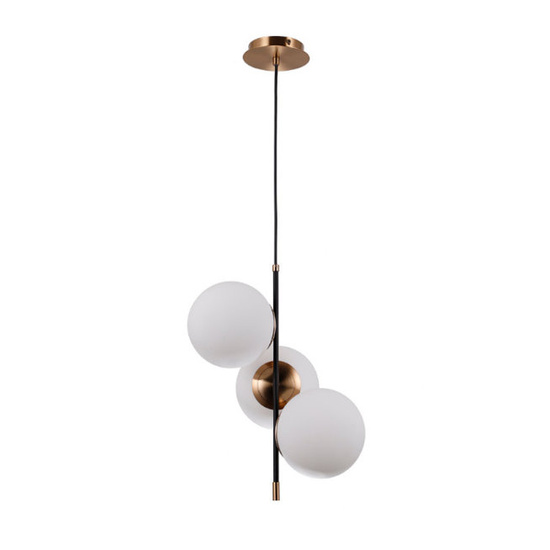 Dekoracyjna lampa składająca się metalowych rurek na końcu których zostały umieszczone białe szklane klosze.