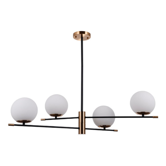 Dekoracyjna lampa składająca się metalowych rurek na końcu których zostały umieszczone białe szklane klosze.