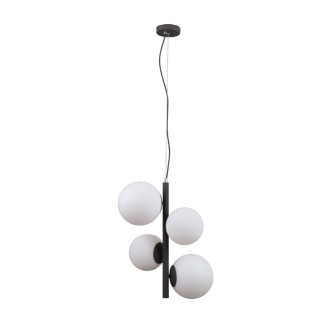 Dekoracyjna lampa składająca się metalowych rurek na końcu których zostały umieszczone białe szklane klosze.