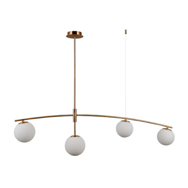 Dekoracyjna lampa składająca się metalowego stelaża na końcach którego zostały umieszczono białe szklane klosze.