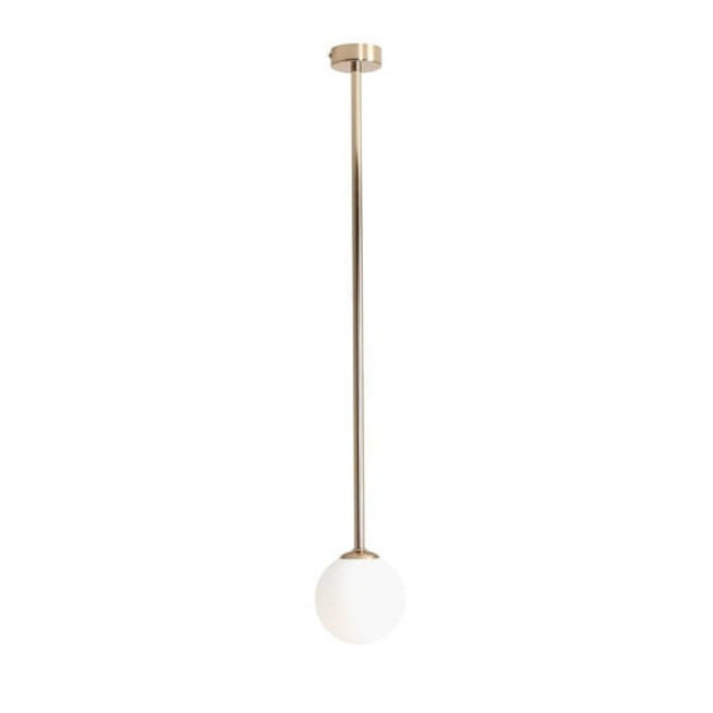 Lampa Pinne to oprawa z mlecznym okrągłym kloszem umieszczonym na sztycy w kolorze złota.