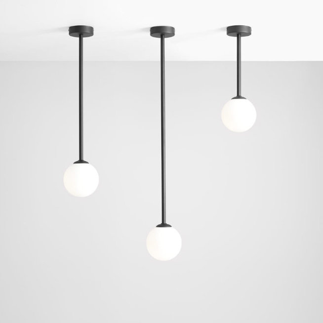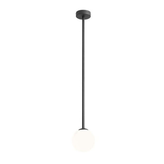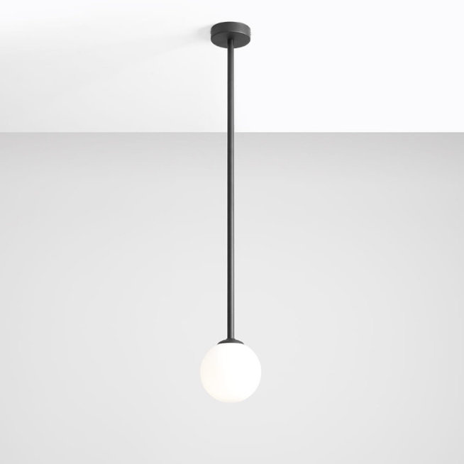 Lampa Pinne to oprawa z mlecznym okrągłym kloszem umieszczonym na czarnej sztycy.