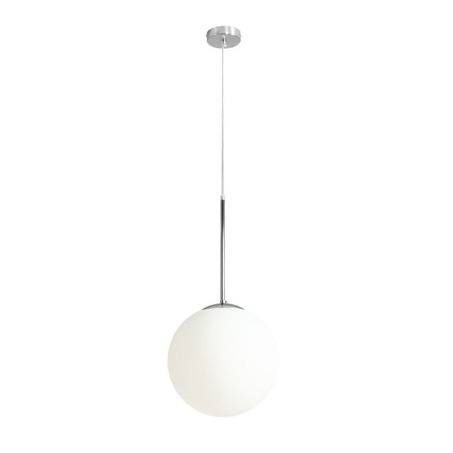 Lampa Bosso to oprawa z mlecznym okrągłym kloszem. Elementy metalowe lampy w kolorze chromowym