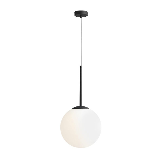 Lampa Bosso to oprawa z mlecznym okrągłym kloszem. Elementy metalowe lampy w kolorze czarnym