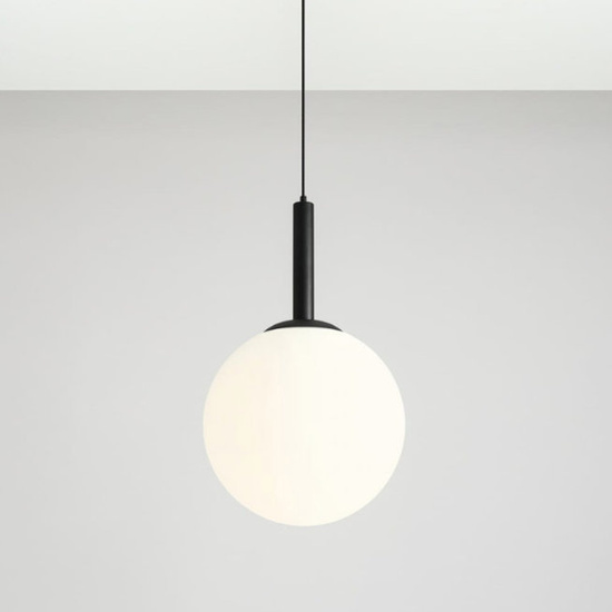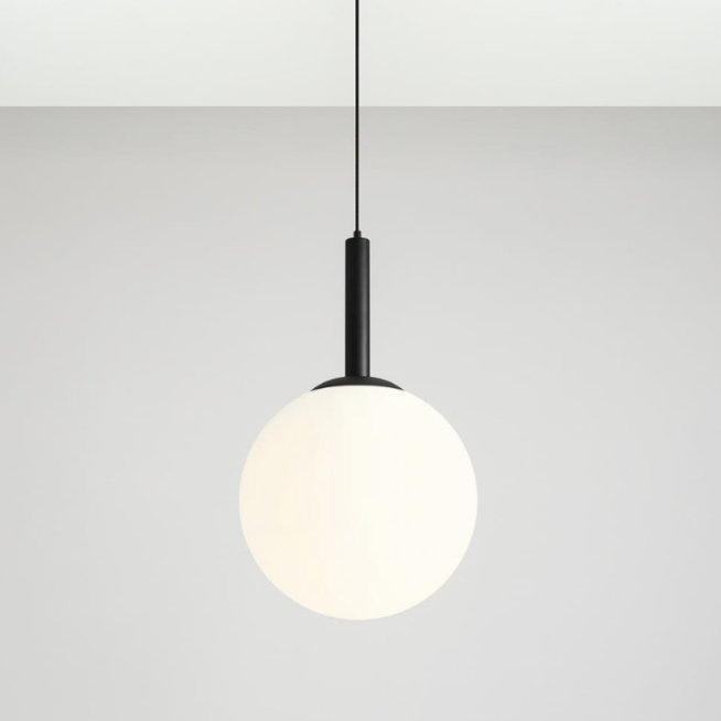 Lampa Bosso to oprawa z mlecznym okrągłym kloszem. Elementy metalowe lampy w kolorze czarnym