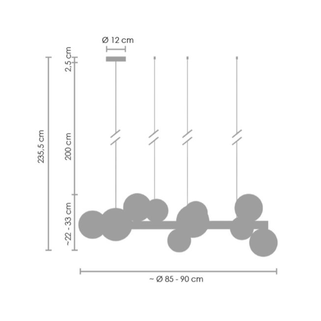 Lampa wykonana została z metalu w kolorze czarny mat. Średnica kul: 15. 12. 10 cm..