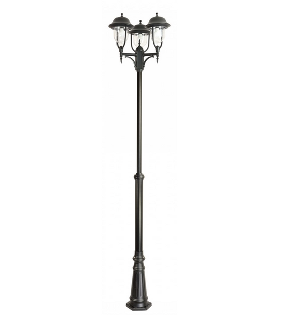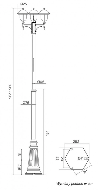Lampa posiada trzy źródła światła (brak w zestawie). Wysokość masztu regulowana w przedziale 195-295 cm.