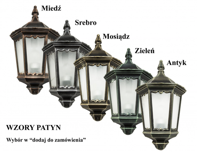 Możliwość wykonania lampy w 6 wariantach kolorystycznych (czarny, patyna złota + 15 % ceny. patyna srebrna + 15 % ceny, patyna miedź + 15 % ceny, zieleń + 15 % ceny, patyna antyk + 20% ceny