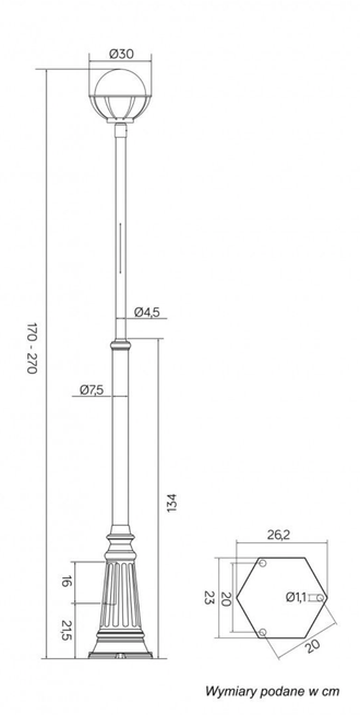 Wysokość masztu regulowana w przedziale 170-270 cm, klosz dostępny w kolorze białym lub przeźroczysto-przydymionym, średnica klosza wynosi 25 cm.