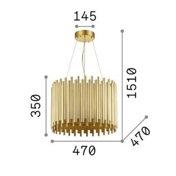 - Lampa posiada metalową ramę. Dyfuzory wykonane są z elementów ozdobnych w kształcie rurki metalowej o różnej długości. Posiada linki stalowe o regulowanej długości.