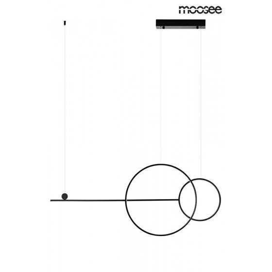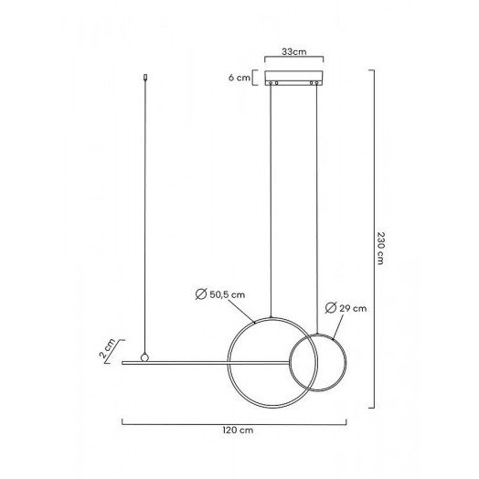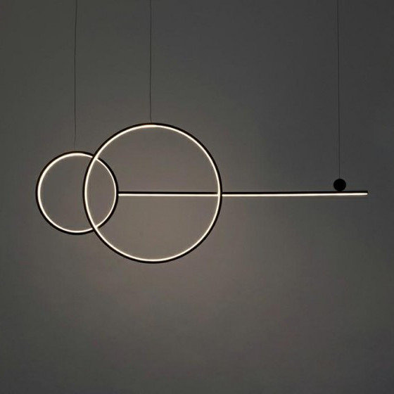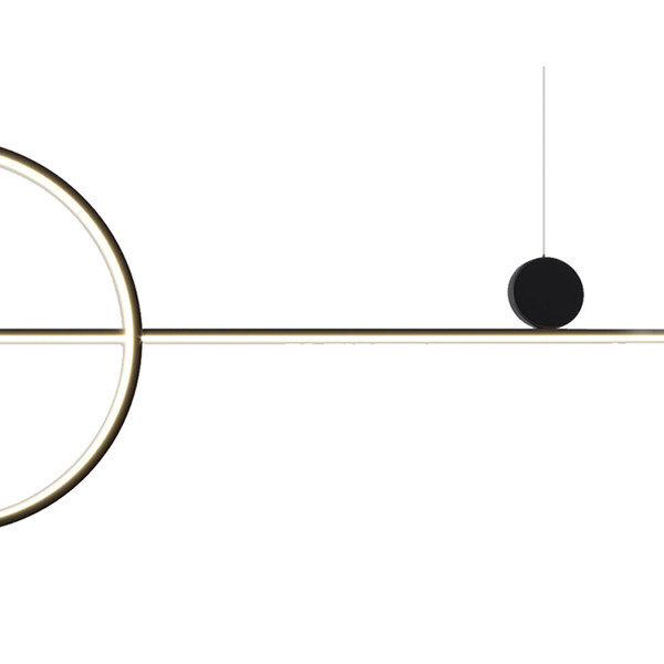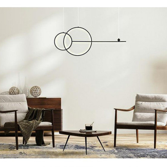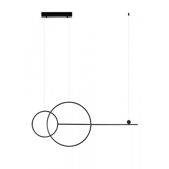 • Nowoczesna lampa wisząca o geometrycznej formie zbudowana jest ze świecących do środka przenikających się obczęczy umieszczonych na poziomej listwie, która świeci w dół. Ledowe światło jest równomiernie rozproszone