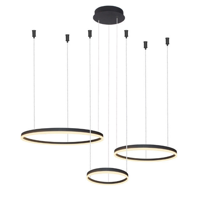 HALO PENDANT 80+60+40 CCT BK + REMOTE CONTROL zbudowana jest z trzech aluminiowych okręgów o różnej średnicy, ułożonych piętrowo względem siebie, zamontowana do sufitu na długich przewodach.