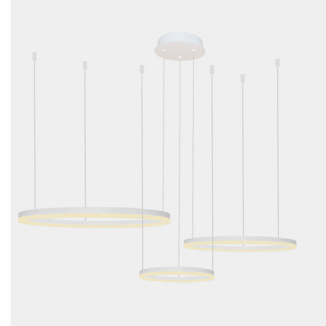 - Lampa wisząca składa się z trzech ringów o różnych średnicach. Zwis jest mocowany do sufitu w ośmiu miejscach. Za pomocą pilota dołączonego do zestawu można zmieniać barwę i natężenie światła.