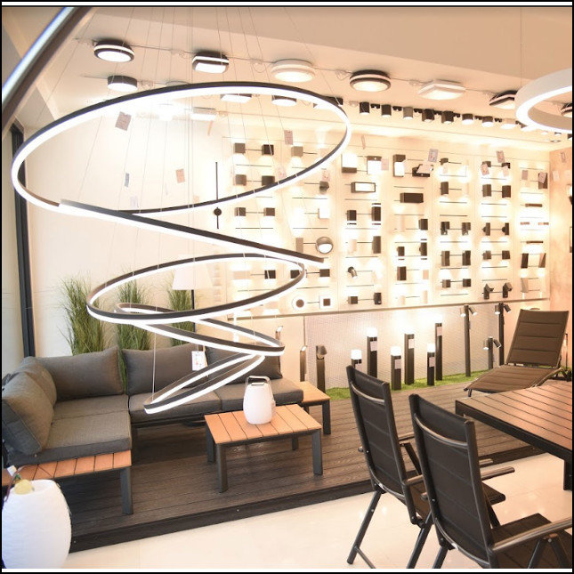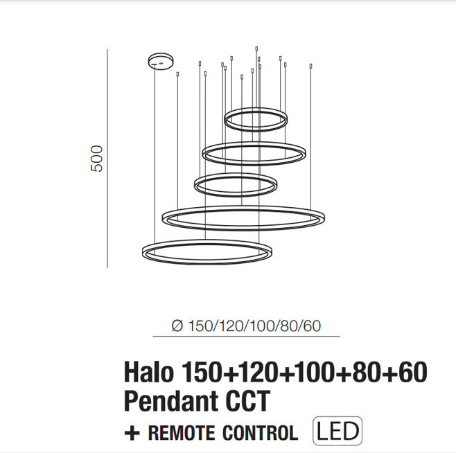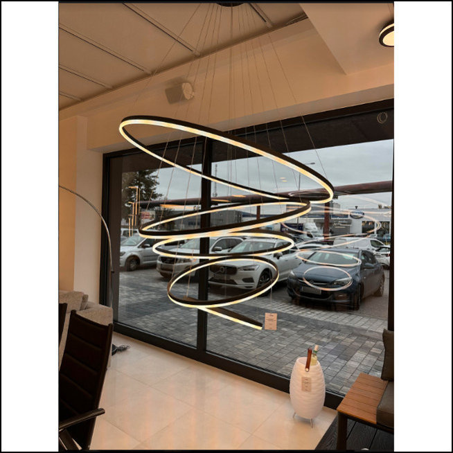 - Lampa wisząca składa się z pięciu ringów o różnych średnicach. Zwis jest mocowany do sufitu w kilkunastu. Za pomocą pilota dołączonego do zestawu można zmieniać barwę i natężenie światła.