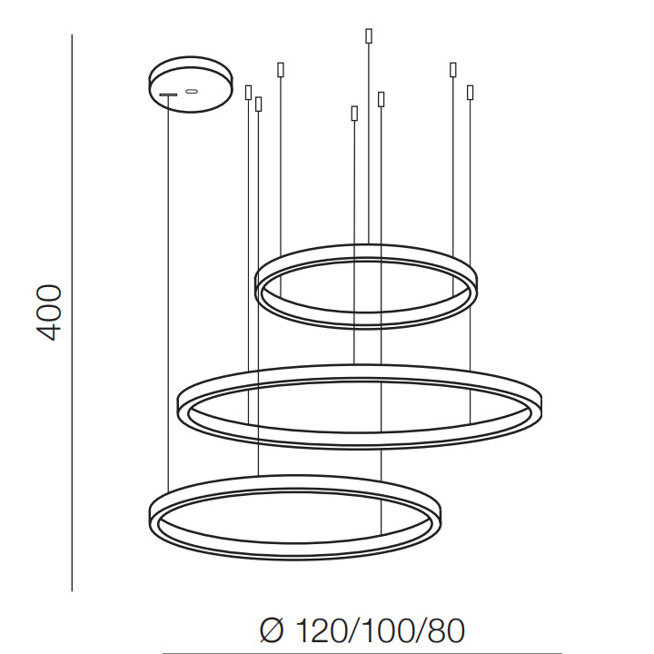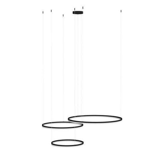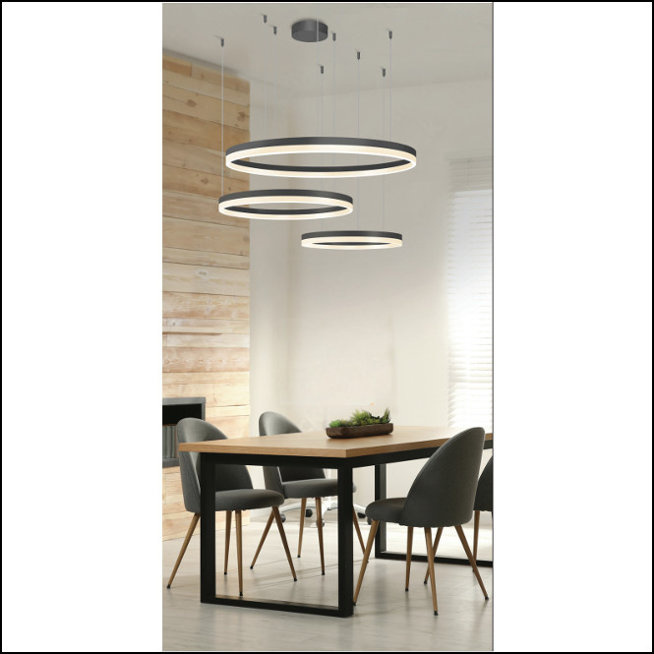 - Lampa wisząca składa się z trzech ringów o różnych średnicach. Zwis jest mocowany do sufitu w ośmiu miejscach. Za pomocą pilota dołączonego do zestawu można zmieniać barwę i natężenie światła.