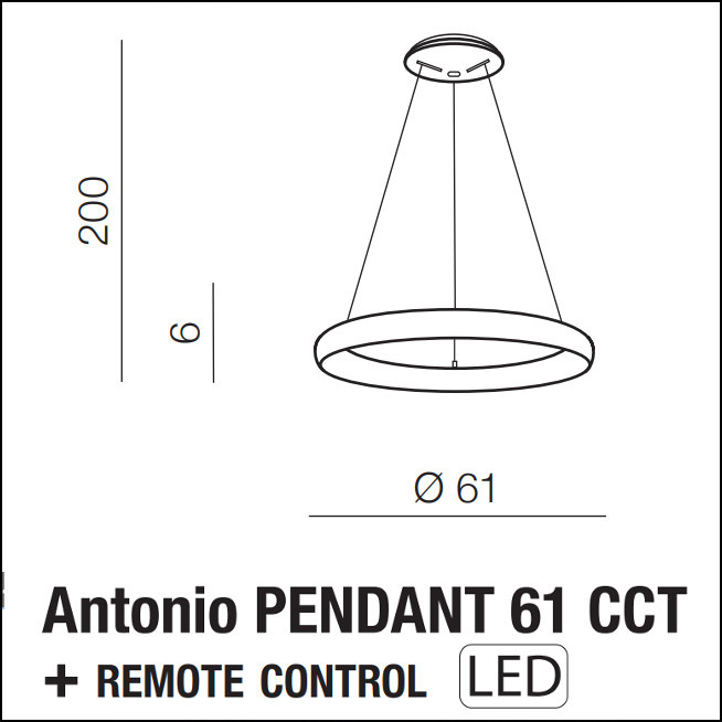 Zwis Antonio wyróżnia nowoczesny design, lekka pełna geometrii forma. Lampa jest precyzyjnie wykonana z metalu i akrylu. Zawiera zintegrowane źródło światła umieszczone wewnątrz obręczy. Lampa jest ściemnialna i zawiera w zestawie pilota do sterowania oświetleniem. Za jego pomocą można regulowac natężenie światła i ustawić barwę z zakresu 3000k-6500K