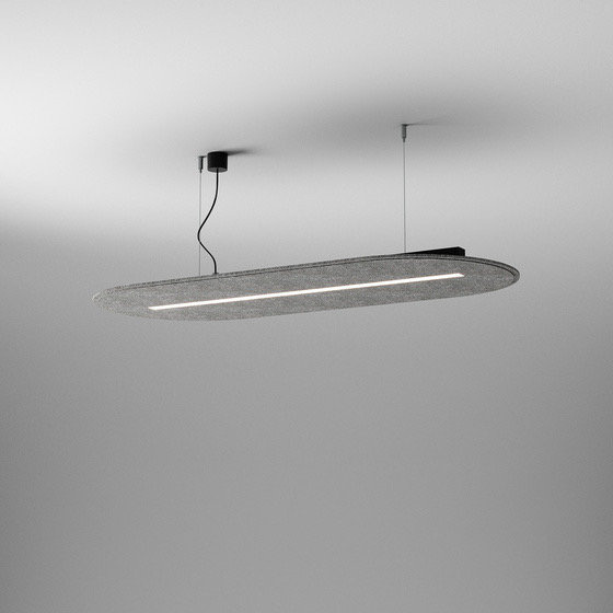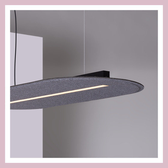 Lampa ujmuje swoją nowoczesną budową, poprawia akustykę wnętrza. Dzwiękochonny filc skraca i ogranicza pogłos we wnętrzu, co ułatwia komunikację