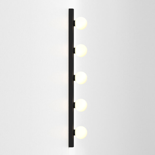 • Nowoczesny wariant oświetlenia hollywoodzkie lustro przeznaczone do łazienek, garderoby lub przebieralni Pięć mlecznych kulistych kloszy z dmuchanego szkła umieszczone na czarnym, subtelnym, metalowym korpusie rówomiernie rozprasza światło.