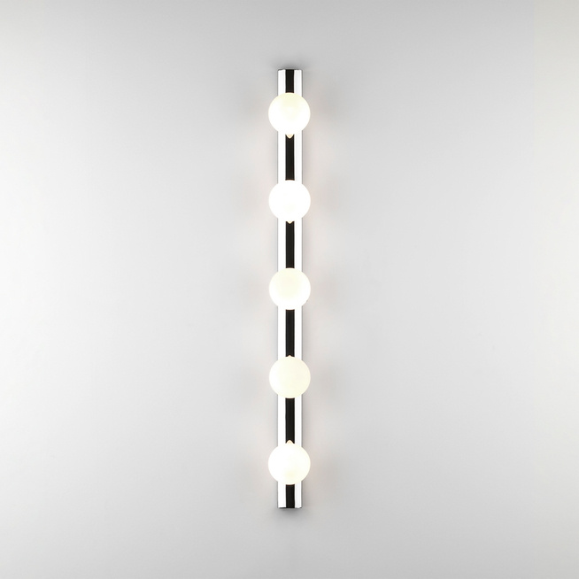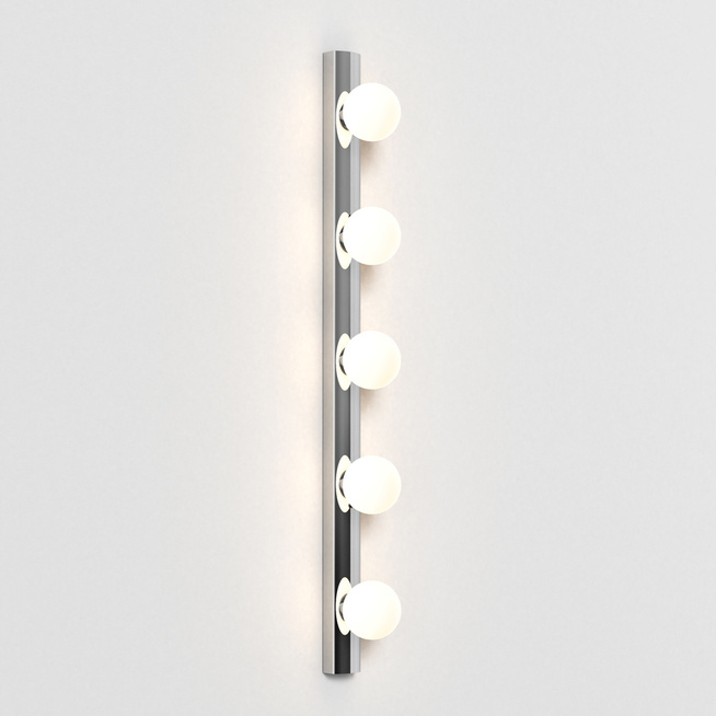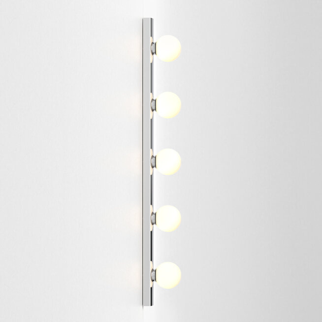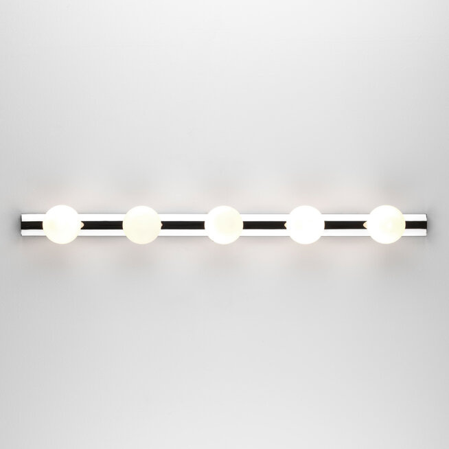 - Nowoczesne oświetlenie - typowe hollywoodzkie lustro przeznaczone do łazienek, garderoby lub przebieralni. Pięć mlecznych kulistych kloszy z dmuchanego szkła umieszczone na chromowym, subtelnym, metalowym korpusie rówomiernie rozprasza światło.
