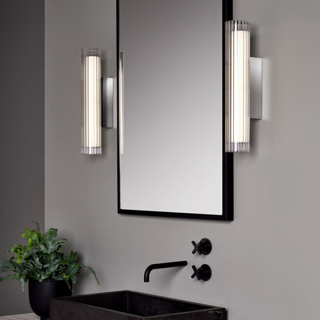 • Kinkiet Io 420 przenaczony do łazienki do montażu przy lustrze w stefie 2 i 3. Lampa zachwyca delikatna elegancją. Na subtelnej chromowej podstawie umiejscowony jest podwójny klosz z zewnątrz transprentny z ryflownego szkła wewnątrz mleczny.