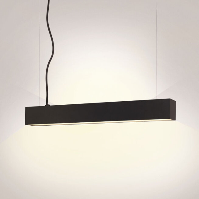 - Lampa wisząca o dwóch źródłach światła. Moduł świecący w górę jest o 30 cm krótszy od długości lampy.