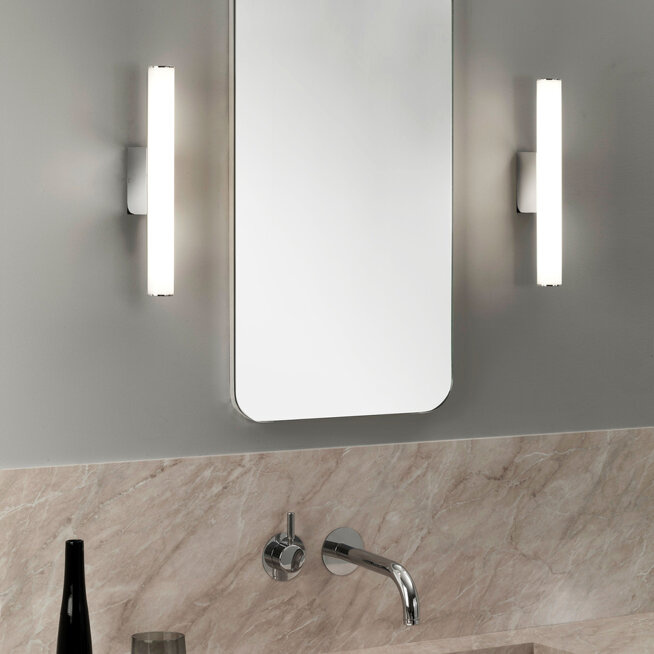 - Elegancki kinkiet łazienkowy, linearna forma, wysoka jakość, odporny na wilgoć, minimalistyczny design, funkcjonalny i dekoracyjny.