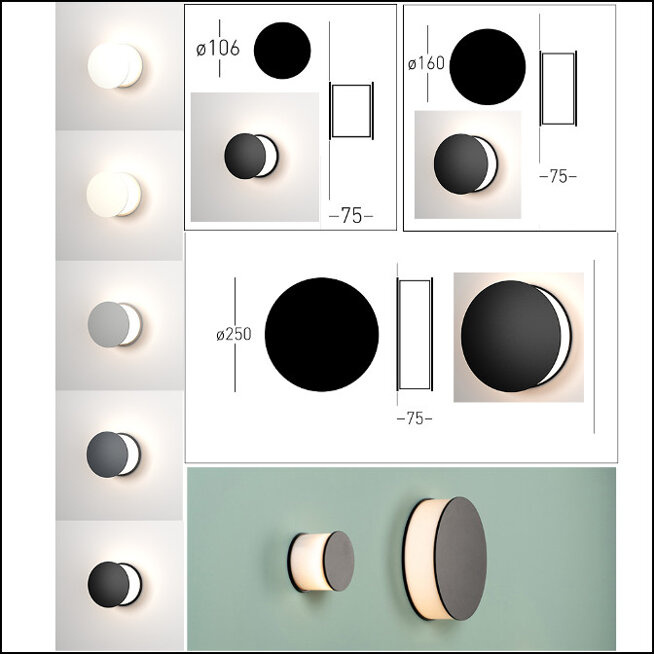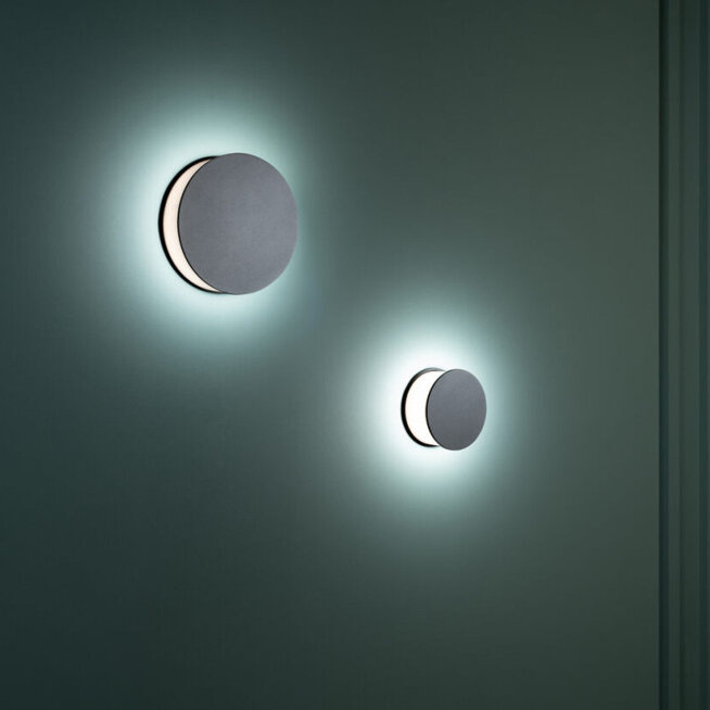 Kinkiety Luno są produkowane w trzech rozmiarach. Pozwala to na tworzenie ciekawych kompozycji na ścianie lub suficie.
