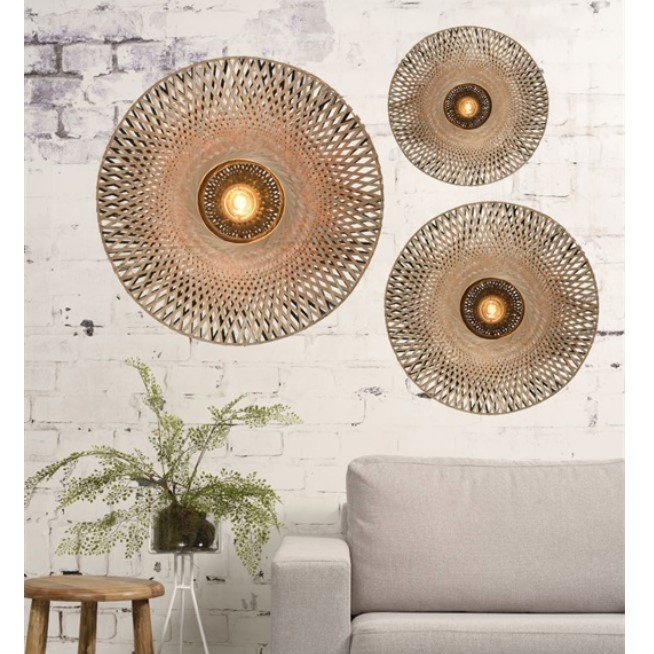 - Lampa ścienna z plecionym abażurem.
