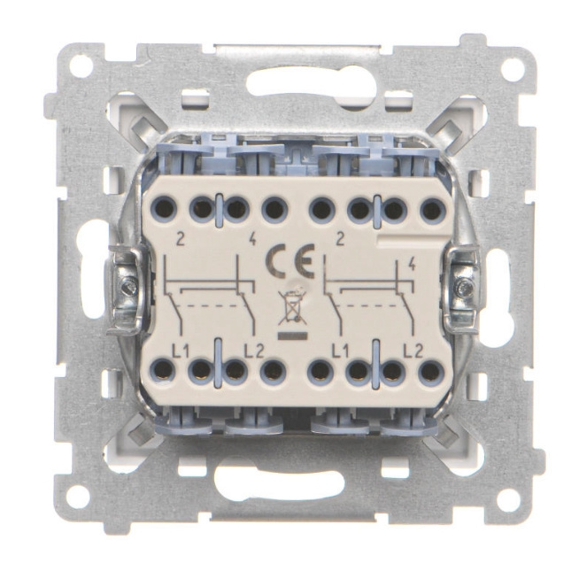 - Podwójny łącznik krzyżowy, modułowy, 10AX, łatwy w montażu, efektywne sterowanie oświetleniem, uniwersalny design.